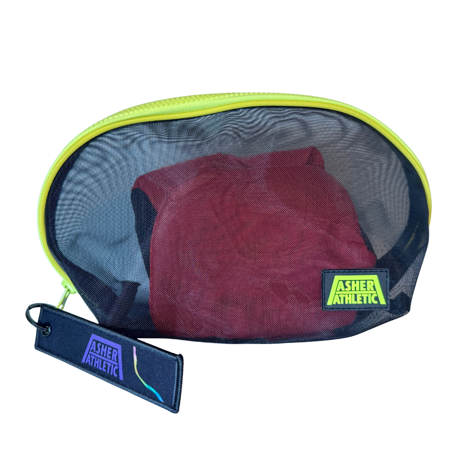 The Gym Clutch stands out with its transparent mesh material that helps with both identifying contents and helping with odor control, vibrant colored accents, and large zipper pull tag that simplifies holding, opening, and closing. Please note, the tag is the same on both bag colors.